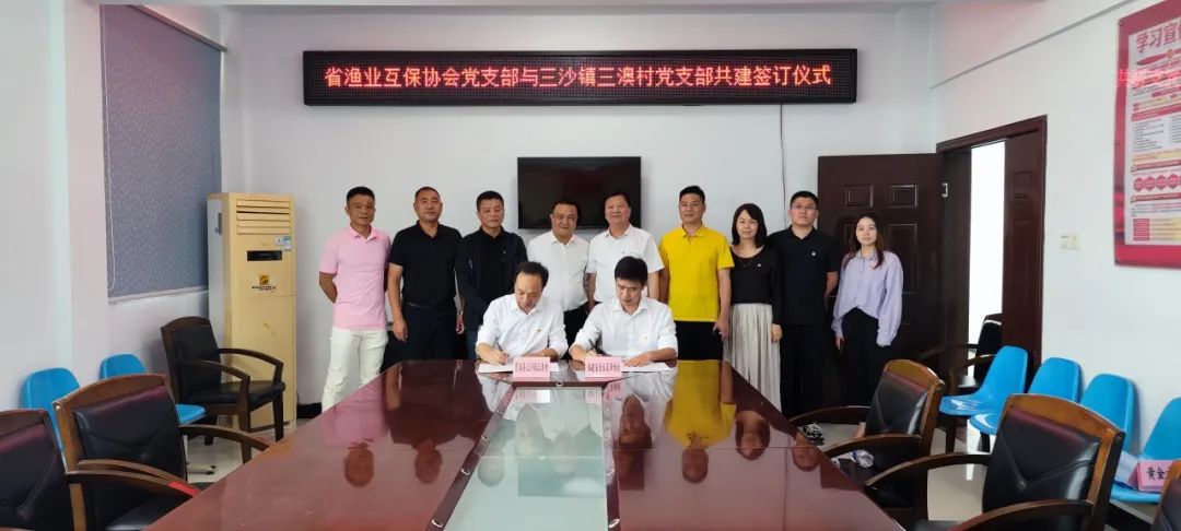 10月9日下午,省渔业互保协会党支部与三沙镇三澳村党支部举行结对共建签订仪式。协会党支部副书记黄金水、三澳村党支部书记陈丕史共同签订了党建共建协议。
