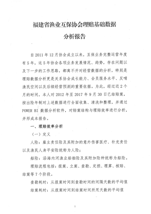福建省渔业互保协会自2012年建立以来,各项工作取得了较大的进步,为促进互保事业的稳健发展,有必要对这5年来协会的各项业务发展情况、趋势、存在的问题以及下一步的工作思路进行数据的分析,特别是理赔数据分析更是协会成长能力、会员服务水平、反哺渔民空间以及后续经营预测的重要依据。为此,会员服务部耗时2个月,提取2012年至2017年9月30日的已结赔案,按出险年制对上述数据进行全面收集和整理,运用数据分析软件,对理赔效率与赔案结构进行分析总结并据此提出下一步工作建议,最终形成报告,于11月20日发布《福建省渔业互保协会理赔基础数据分析报告》。