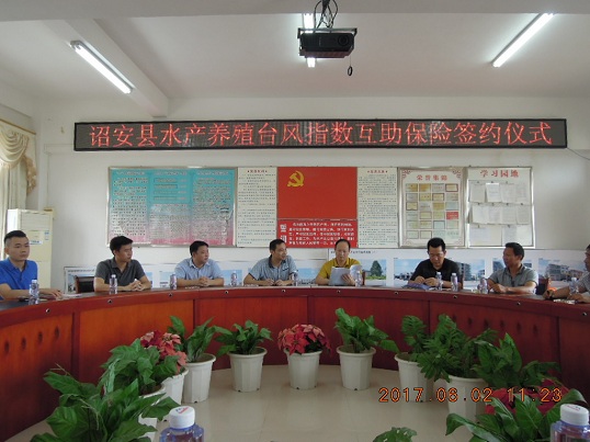 6月2日,福建省首笔“台风指数保险互保协议”签约仪式在诏安县四都镇举行。签约仪式由诏安县海洋与渔业局副局长兼省渔业互保协会诏安县办事处主任张志敏主持。诏安县四都镇沈怀贵镇长、省渔业互保协会秘书处承保部黄金水总经理及市县办事处负责人、四都镇重点水产养殖村林头村书记、诏安县人寿财保公司代表、部分养殖合作社负责人、养殖户代表参加了此次签约仪式。