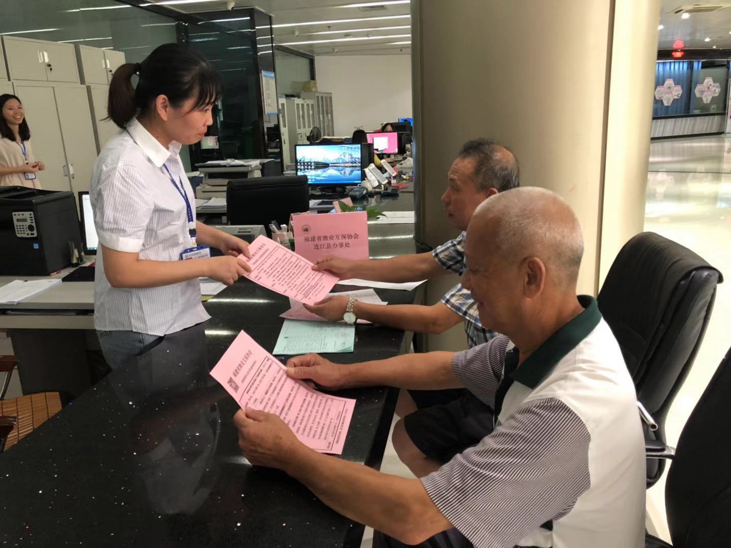 为更好践行渔业互保“互助共济 服务渔业”的办会宗旨,2015年7月,连江县办事处与县行政服务中心积极对接,在政务服务大厅设立了(59)渔业保险窗口,为渔民群众提供“一站式”的政务服务,进一步让广大渔民群众享受到优质、高效、便捷的服务。
