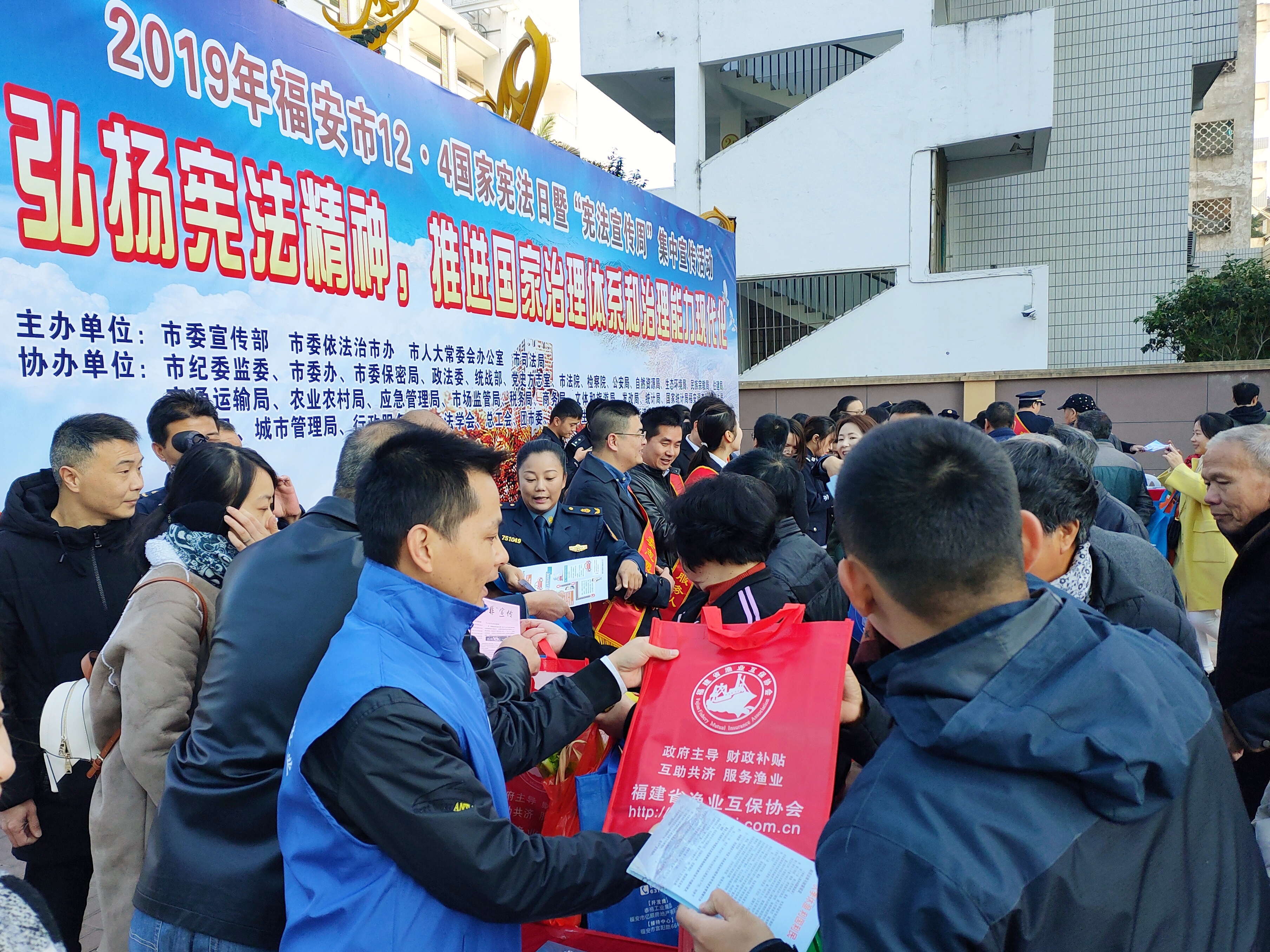 12月4日上午,福安市2019年“12·4”国家宪法日暨“宪法宣传周”宣传活动在市新村广场举行,办事处工作人员在渔业主管部门及其他相关部门的组织下,充分发挥宪法宣传主渠道的作用,推动宪法宣传教育,并有机结合渔业互保政策、渔业船舶安全生产等内容,对渔民群众提出的各类涉海涉渔法律问题及互保专业问题予以耐心解答,同时引导渔民群众遵法、学法、守法、用法,自觉维护宪法权威,遇到涉及自身保险权益的矛盾纠纷坚持通过合法途径维护自身合法权益。