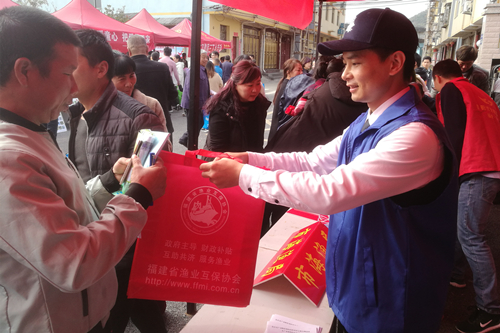 活动现场人头攒动,把浓浓的年味提前送到渔家,四邻八乡的渔民早早聚集到渔民广场,像过年一样热闹。由省渔业互保协会福安市营业部联合福安市海洋与渔业局组成的海洋渔业服务队,为渔民群众提供现场咨询服务,分发《福建省渔业互保手册》、《海洋与渔业防灾减灾宣传单》等宣传材料,并送上精心准备的春联等宣传品。对养殖户关心的台风指数保险投保时间、理赔条件,养殖渔工保险投保要求等渔业互保相关知识和优惠政策,工作人员都耐心给予一一答复。