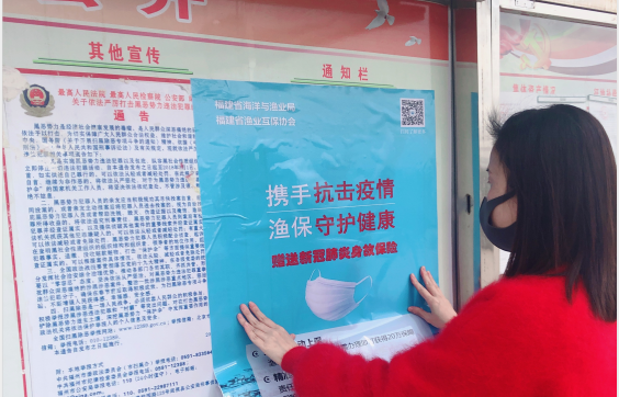 为切实保障辖区渔民会员及渔工的生命健康,福清市营业部在接到省渔业互保协会关于赠送新型冠状病毒肺炎身故险的通知后迅速做出工作部署。一是在本辖区开展新型冠状病毒肺炎感染情况的摸排工作,确定辖区内是否有渔民会员及渔工感染;二是通过短信平台向辖区各沿海乡镇渔业干部及渔业从业人员传递协会关于赠送新型冠状病毒肺炎身故险的信息,做到应知尽知;三是印制新冠险宣传海报,并会同主管局、执法大队到沿海乡镇和重点渔村进行张贴宣传。