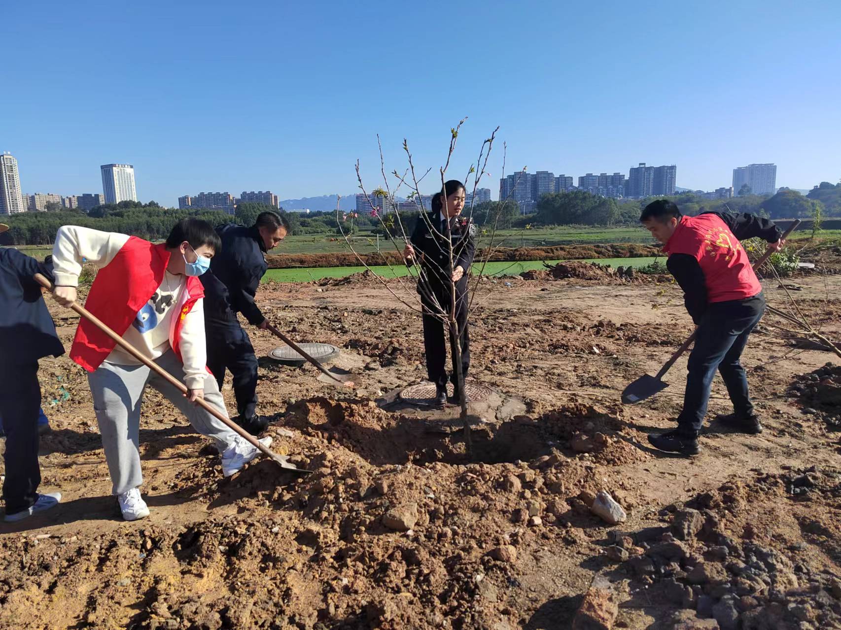 活动现场,全体人员热情高涨、干劲十足。放眼望去,植树现场一片繁忙。大家干劲十足、分工协作,或两人一组,或三五成群,挥锹铲土、扶树填坑、踏土夯苗、提水浇灌,每个步骤都做得有条不紊。经过一上午的努力,树苗迎风而立、错落有致,在春日的阳光下展现出勃勃生机。这一刻,“党建红”和“生态绿”交相辉映,形成一道靓丽的风景线。同时党员干部职工还积极向过往行人及田间劳作群众宣传植树造林的重要意义,发动群众积极参与,营造全民义务植树的良好氛围。