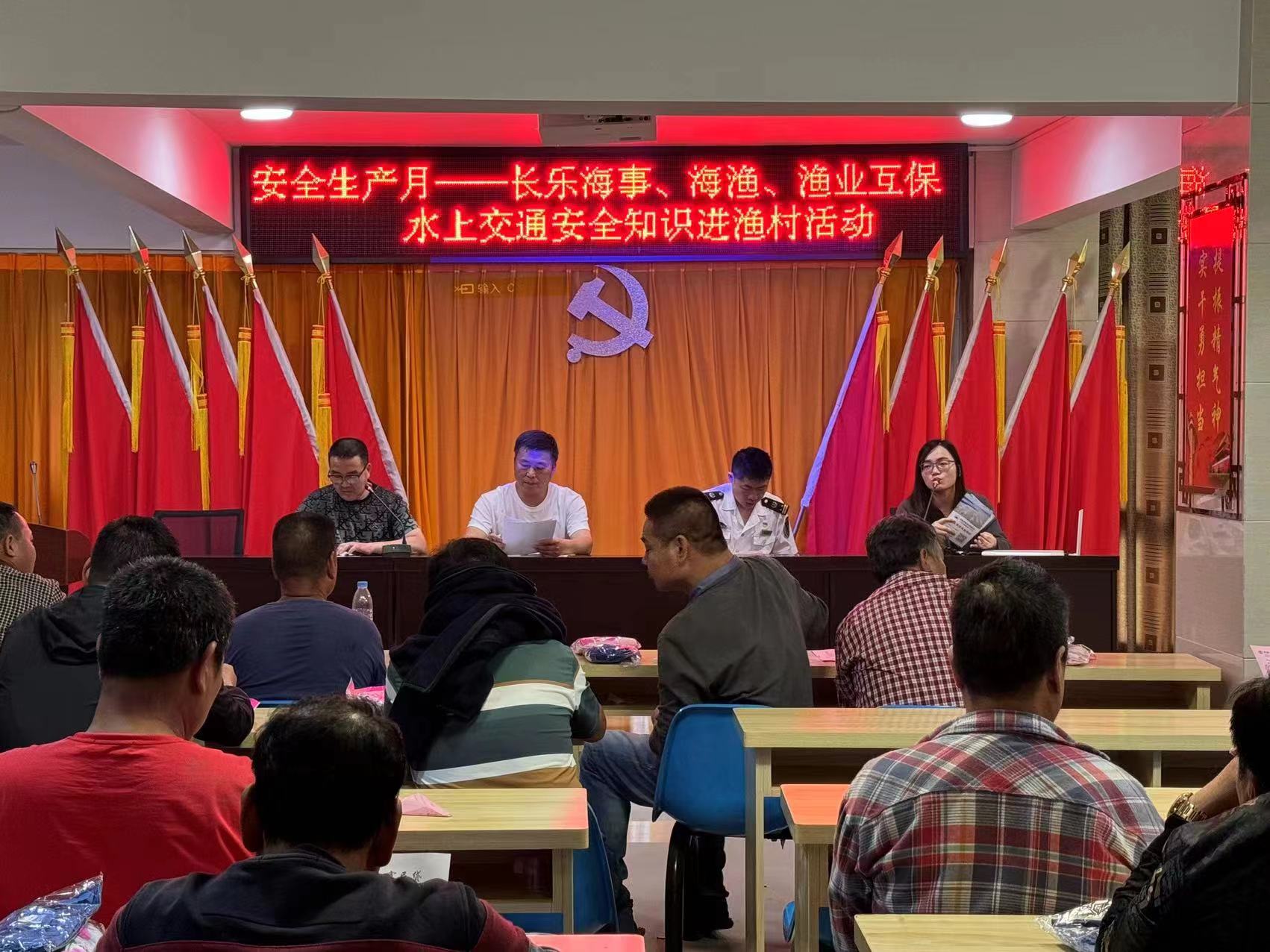为做好“商渔共治2024”专项行动工作,有效防范海上商渔船碰撞事故发生,进一步提升渔民群众安全生产风险防控意识。6月5日,长乐区办事处联合区海事处、区海洋与渔业局深入潭头镇福星村开展水上交通安全知识进渔村活动及渔业互保政策宣讲会。