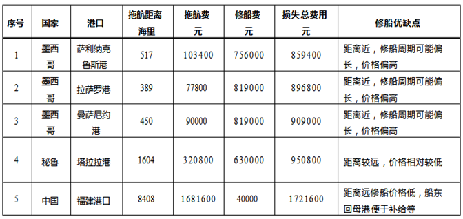 一是可供该轮进行修理的地点最方便最经济的地方应是墨西哥西海岸。因为A船拖带到出险位置附近的港口进行维修的费用约为90万元,而A船拖带到中国福建港口进行维修的费用则约为人民币172万元。