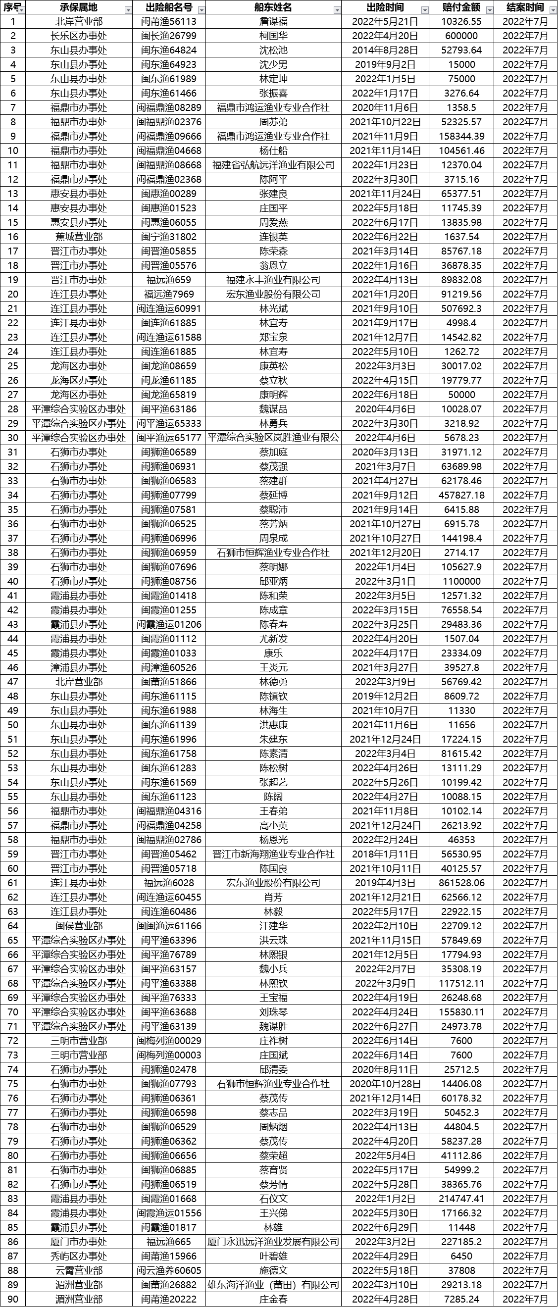 2022年7月赔案