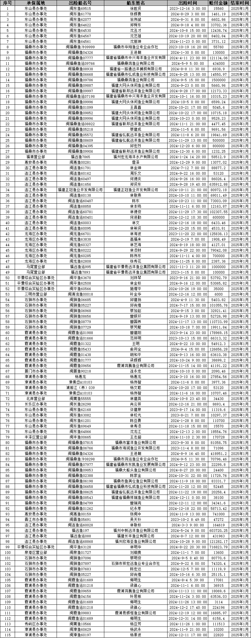 2025年1月赔案