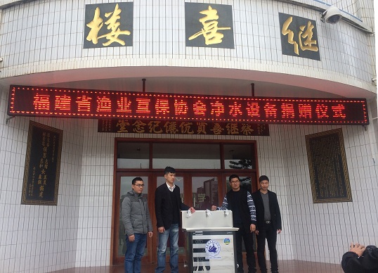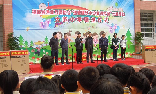 福建省渔业互保协会的工作人员在开展渔业安全生产宣传活动时,发现渔区饮用水普遍存在盐碱度高,不适合孩子饮用的问题。为了给孩子们提供健康的饮水条件,福建省渔业互保协会经研究决定,向连江县黄岐中心小学、惠安县大祚小学、晋江市深沪中心小学、石狮市祥芝中心小学等九个中心渔港的九所中心小学赠送可以过滤加热自来水的专业净水设备。该批净水设备受到了当地老师、学生和渔民的热烈欢迎,纷纷表示福建省渔业互保协会解决了当地孩子在学校喝上健康水的大问题。黄岐中心小学校长在采访中道出了自己的心理话:“渔业互保协会此举,给我们的孩子在饮水方面的健康,提供了一个非常好的保障,解决了学校的燃眉之急,”。