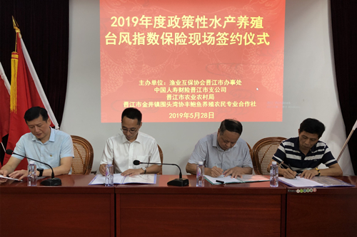 2019年5月28日上午,年度政策性水产养殖台风指数保险现场签约仪式在晋江市举行。省渔业互保协会泉州办事处主任黄献良,晋江市农业农村局、省渔业互保协会晋江办事处、中国人寿财险晋江市支公司相关工作人员,及晋江市金井镇围头湾协丰鲍鱼养殖农民专业合作社相关负责人分别出席签约仪式。