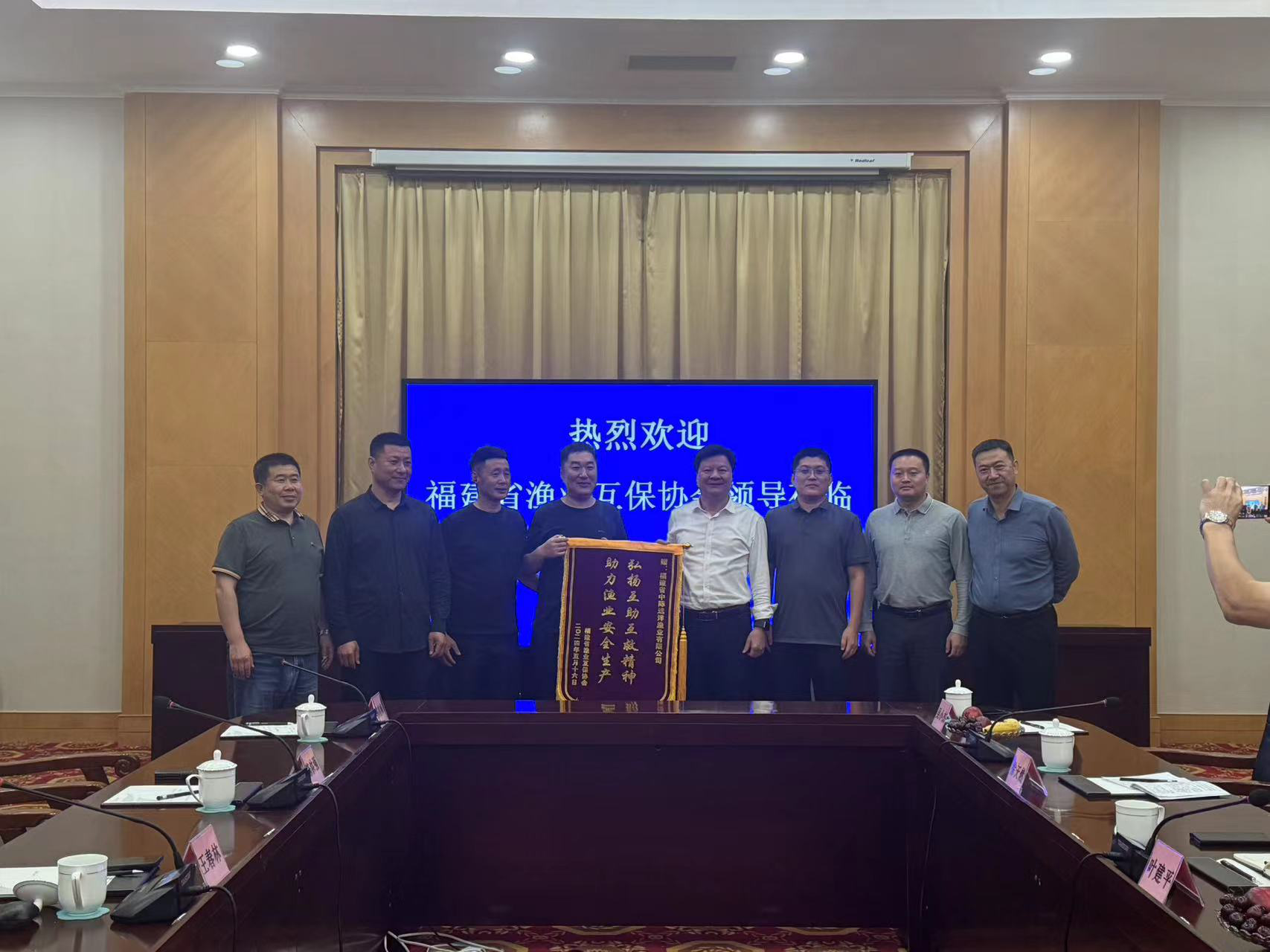 近日,协会第一书记叶建平、福建万通渔业有限公司董事长郭定君等一行赴山东省荣成市,向福建省中际远洋渔业有限公司董事长王春林赠送锦旗,以表彰该公司的公海救援行为。