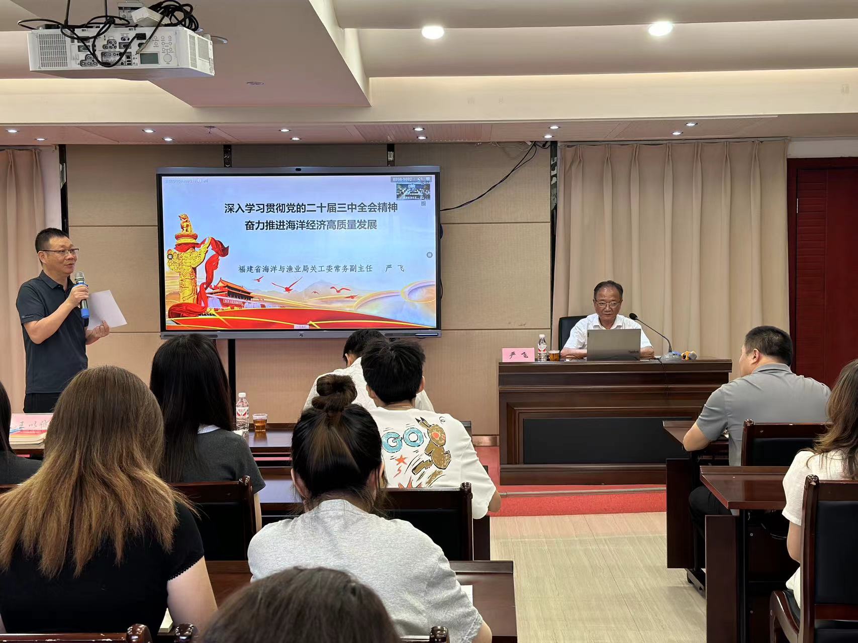 讲座中,严飞同志以“深入学习贯彻党的二十届三中全会精神,全力推进海洋经济高质量发展”为主题,从多个维度全面解读了二十届三中全会的核心内容和重要意义。首先强调了党的二十届三中全会关于“进一步全面深化改革、推进中国式现代化”的会议主题;详细阐述了进一步全面深化改革的重要性和必要性,强调了“六个必然要求”和“四个迫切需要”;深入解读了进一步全面深化改革的“六个坚持”重大原则。最后严飞同志结合我省海洋与渔业的实际情况,提出了具体的贯彻落实措施。他强调,要深入学习贯彻全会精神,加强海洋与渔业的改革举措组织实施,完善海洋发展体制机制,优化海洋经济发展布局,强化海洋经济创新动能,壮大海洋新兴优势产业,健全海洋开发保护制度,扩大海洋经济开放合作。