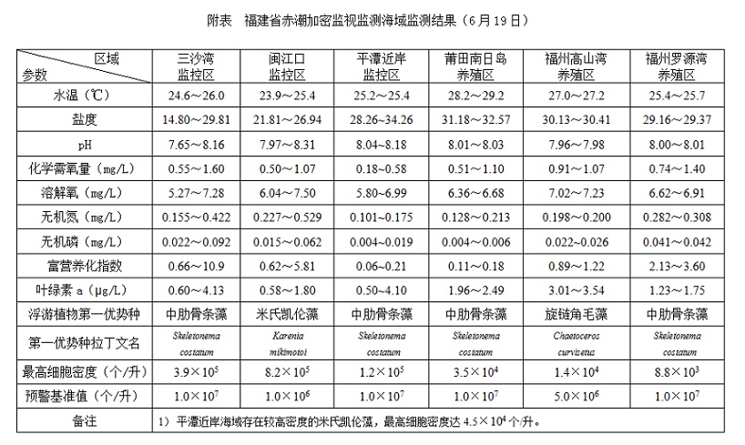 6月19日,我厅对3个赤潮监控区(三沙湾、闽江口、平潭近岸)和2个重点养殖区(福州、莆田)开展赤潮加密监视监测,各海域未发生赤潮。具体监测结果与赤潮预警如下: