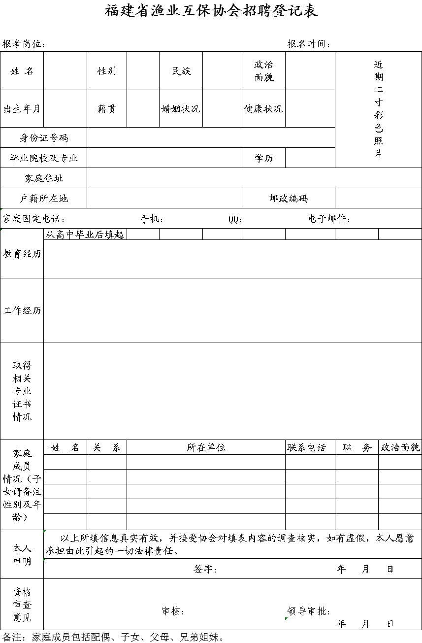 将个人简历、学历学位证书、身份证等复印件和近期2寸彩色照片(免冠)2张,直接寄到福建省渔业互保协会(福州市鼓楼区华林路201号华林大厦6层A区)或发送邮件fjyyhb_hr@163.com,经初审合格,即通知面谈,面谈时应携带本人身份证、学历学位证书等相关证件核对身份(本次应聘资料恕不退回)。应聘人员可登录http://www.ffmi.com.cn(福建省渔业互保协会网站)下载报名表。